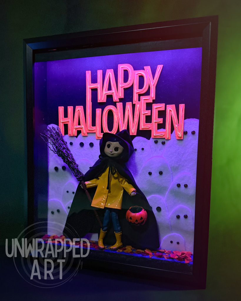 Our limited release of this large scene features a custom Coraline doll with fluorescent painted details and button eyed ghost friends. Includes hand painted props built to scale and integrated lights for your favorite twitchy witchy girl.